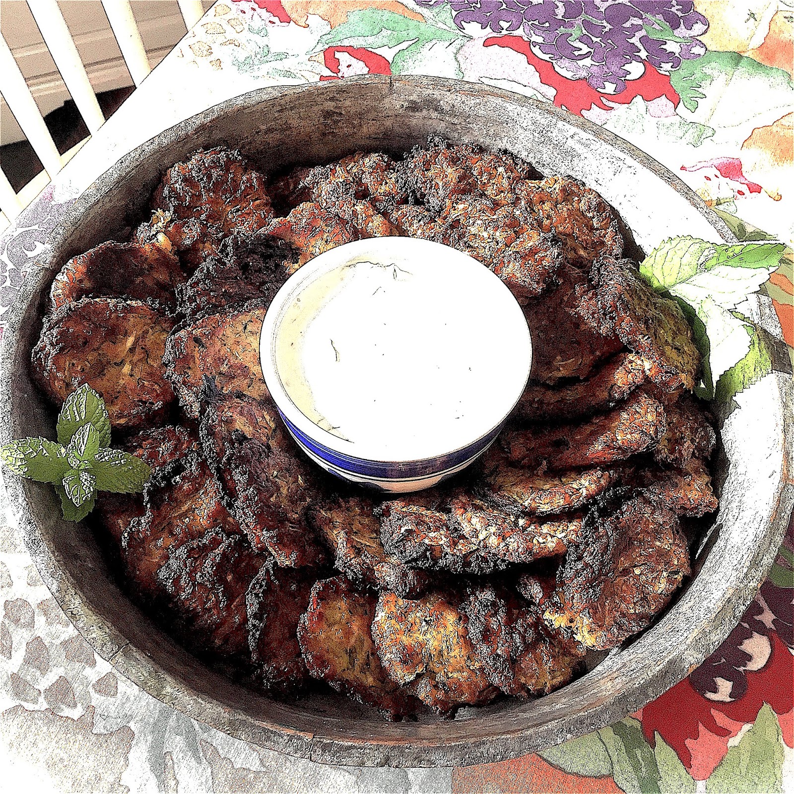 What I love about these Kolokithokeftedes as they are known in Greece, along with the flavor, is the way they use up those baseball bat sized zucchini. But I also love them because I figured out they could be baked and come out looking fried. This makes them not only easier and less messy to prepare but healthier to eat. They look elegant on a large plate with a bowl of tsatsiki (the Greek yogurt, dill and cucumber mix also known as raita in Indian cooking) in the center and lemon wedges all around.